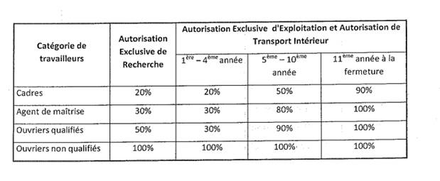 L’article 12 fait obligation à toutes les parties prenantes d’employer en priorité le personnel nigérien. En effet, il précise que « l’opérateur, les sous-traitants, les prestataires de services ainsi que les fournisseurs de biens doivent employer en priorité du personnel nigérien ». Dans cette perspective, un programme de recrutement, de compagnonnage, de formation et de promotion du personnel nigérien doit être mis en place. Ce programme doit intéresser tous les domaines des mines et des hydrocarbures. Cette exigence de programmation et de formation est d’une importance capitale dans la pérennisation des actions. Il indique, de la part du législateur nigérien, un souci de planification permettant de suivre et d’évaluer les impacts réels desdites actions. L’ordonnance ne précise pas la part de quota obligatoirement réservée au personnel de nationalité nigérienne dans les différents sous-secteurs. L’article 12 in fine précise que cette préoccupation sera prise en charge par voie règlementaire. Espérons que les autorités hâterons l’adoption de ces mesures pour rendre effective cette exigence. Au surplus, pour éviter les frustrations et les discriminations constatées entre les nigériens et les expatriés dans les traitements et les salaires, l’article 13[10] pose sans équivoque le principe d’égalité en la matière. En tout cas, le Code pétrolier[11], en plus de l’exigence de priorité au personnel de nationalité nigérienne, impose le respect de « quotas minimums d’employés de nationalité nigérienne par catégories d’emplois définis dans le décret d’application »[12]. La nomenclature de ces quotas minimums a été précisée par l’article 79 du décret d’application[13] du Code Pétrolier. Cet article prévoit quatre catégories de travailleurs que sont : les cadres, les agents de maitrise, les ouvriers qualifiés et les ouvriers non qualifiés. Le tableau ci-dessous détaille les pourcentages des quotas par catégorie et par tranche d’années d’activités.